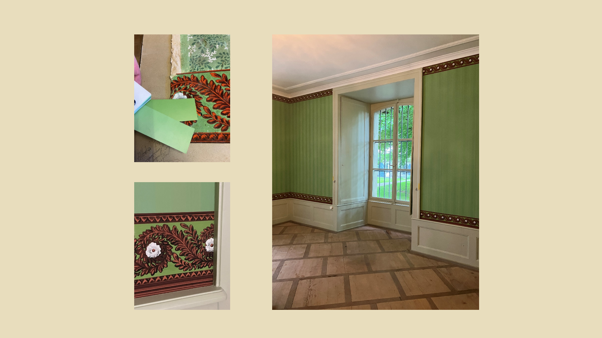 Muster und Motive können stilgerecht oder neu interpretiert auf Bahnen gedruckt werden – in variierbarer Formensprache und angepasster Farbigkeit auf unterschiedlichen Trägermaterialien. Auch flächige Farbaufträge in unterschiedlichen Techniken kommen zum Einsatz – als reduzierte, aber wirkungsvolle Form der Wandgestaltung.